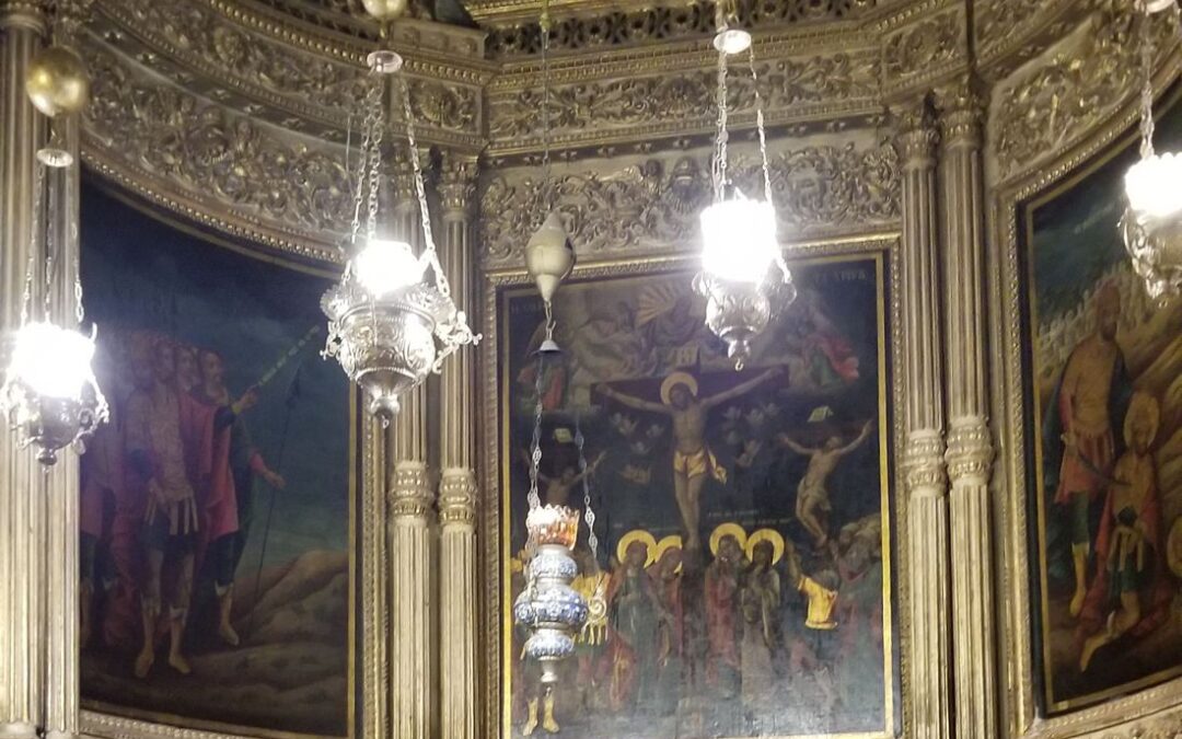 The FPCD Israel tour visited the Garden Tomb and the Church of the Holy Sepulchre, the two locations most likely to be where Jesus was crucified. This picture was taken inside the church with the center image depicting the crucifixion with the criminals shown beside Jesus.